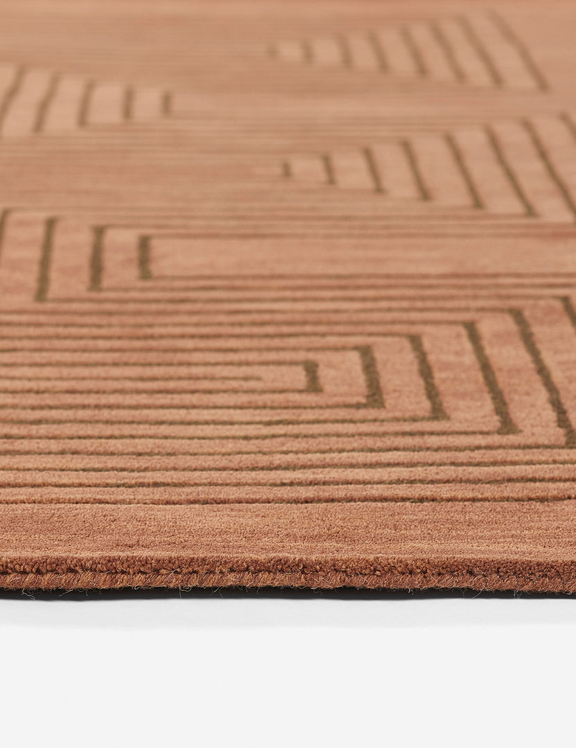 An intricate, maze-like design pops against rich, heathered copper hue of this understated, modern area rug. Made from hand-tufted wool fibers, it's a durable accent that seamlessly adapts to different rooms. Style this soft, tonal floor rug beside your bed or sofa, or under your dining table.