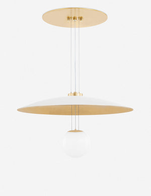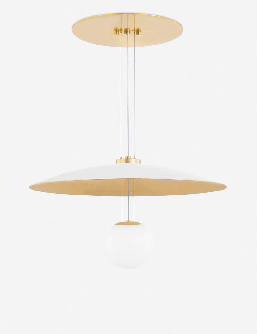 Clean lines create a striking modern tone in this hanging light fixture. The two-tone shade and suspended globe fashion this pendant light with a dynamic silhouette for bright appeal overhead.
