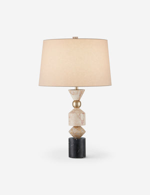 The Socorro table lamp pairs natural stone with metallic details for standout appeal. Its totemic form features marble layered in varied tones and shapes, finished with a soft linen shade. Style this geometric lamp on a console, desk, or sideboard to show off its bold material mix.