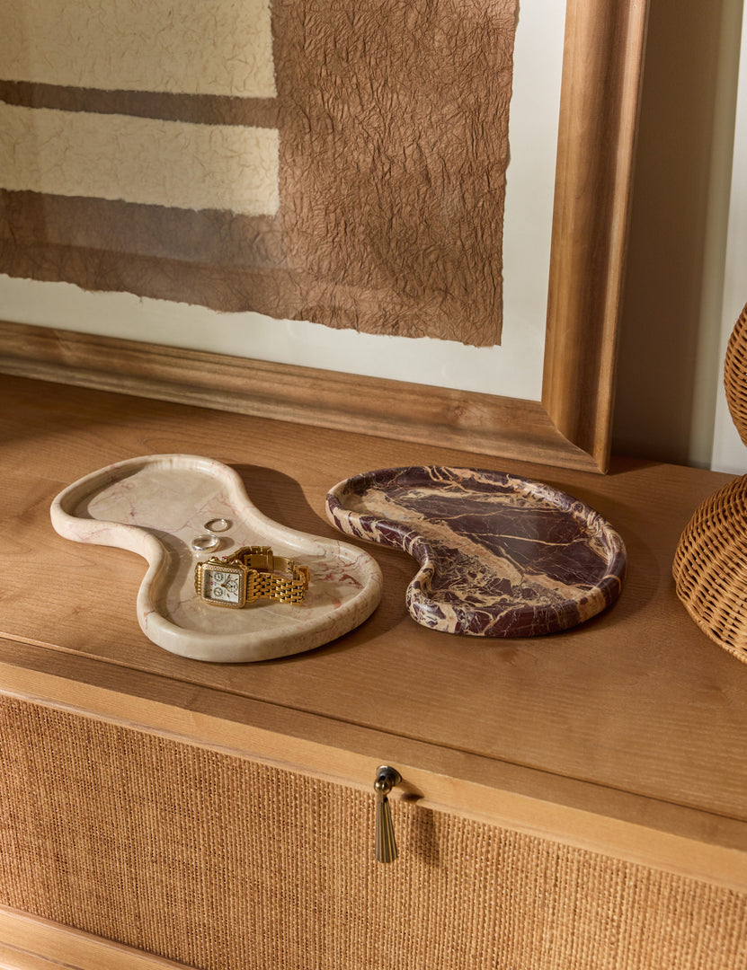Two marble trays, each with a distinct organic shape that showcases the dramatic veining of the stone. A raised lip frames each tray, making them the perfect catchall for jewelry, keys, or artful accents.