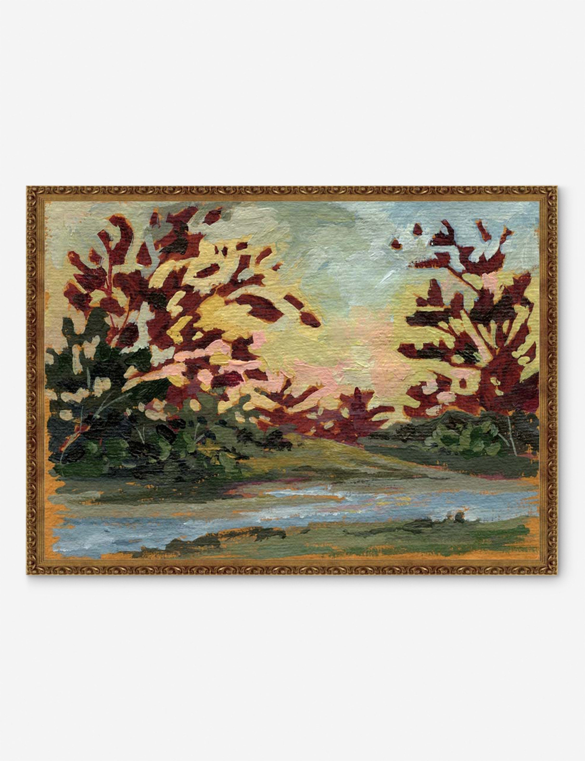 In this wall art print by artist Laurel-Dawn Latshaw, turning leaves ignite a gold and pink sky. With a keen eye for changing light and soft visible brushstrokes, this impressionistic wall artwork captures a seasonal landscape with a warm, painterly air.