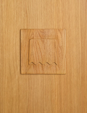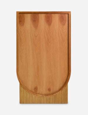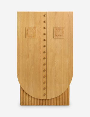 This tall bar cabinet stands out with a formal silhouette and sculptural detailing. An inverted arch adds a subtle curve to the design, while rounded wood pulls bring a buttoned-up touch, and the ribbed plinth base grounds the piece with a textural base. This piece is from our exclusive Sarah Sherman Samuel collaboration and features all the trademarks of her warm, edited style.