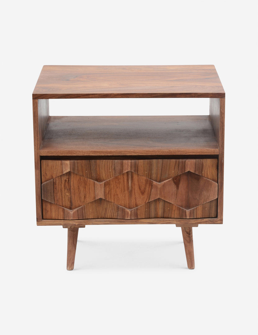 With mid-century modern inspiration, this sheesham wood nightstand blends retro and contemporary style. Featuring an open shelf and one-drawer design with intricate wood detailing, plus tapered legs to complete the look.