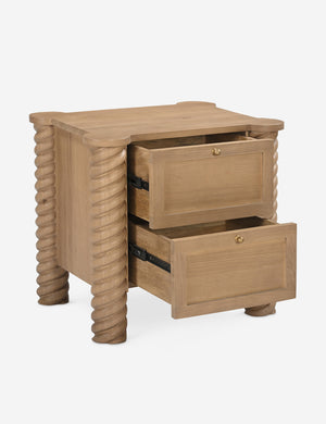 The Treccia nightstand embodies a contemporary reinterpretation of classical aesthetics, distinguished by its intricate turned and braided details. The nightstand features exaggerated, elegantly detailed legs, presenting a bold modern twist while ensuring practicality. Its design is visually appealing while creating a welcoming, uncluttered space for everyday use.