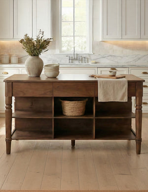 The Trusley kitchen island offers classic character while extending your kitchen workspace. Turned legs, a warm finish, and open shelving make it a natural fit for traditional or transitional kitchens. With space to prep, serve, or gather, it's a grounding anchor piece with timeless appeal.