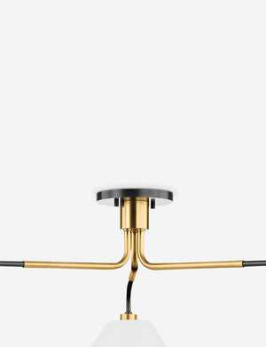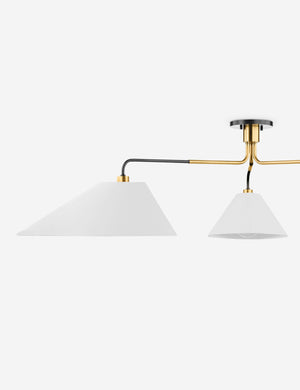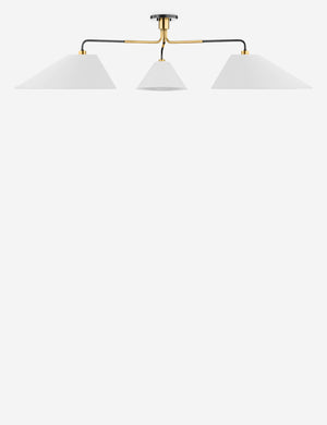 It's all about the angles with this sleek modern chandelier. This black-and-brass finished fixture is an exciting addition to any space and features a three-light design with linen shades that point and play with light. Style this chandelier above your dining table or coffee table.