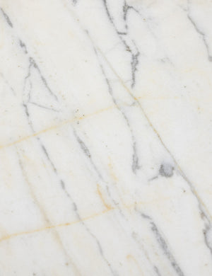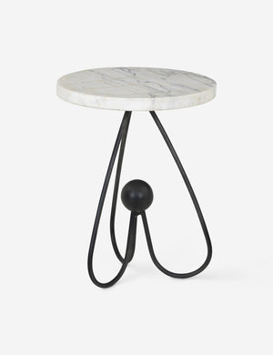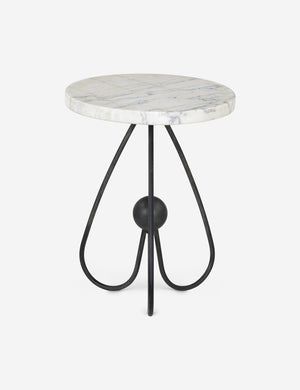 The Vanetta side table brings bold detail in a compact silhouette. Its hammered metal base features three looped legs joined by a central ball accent and topped with a round marble surface. Style it as an end table next to a lounge chair or use it to add a sculptural touch to a small corner or hallway.