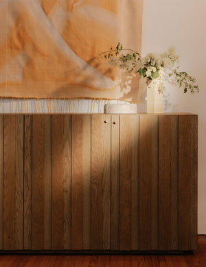 Gillian Segal brings her distinct blend of modern eclecticism and keen eye for delivering the unexpected to this collection for Moe's. The Vermentino sideboard draws inspiration from Italian vistas and mid-century design. Elegant in its simplicity, this sideboard cabinet combines two-tone striped wood and Italian mid-century elements to evoke a timeless aesthetic with fresh charm.