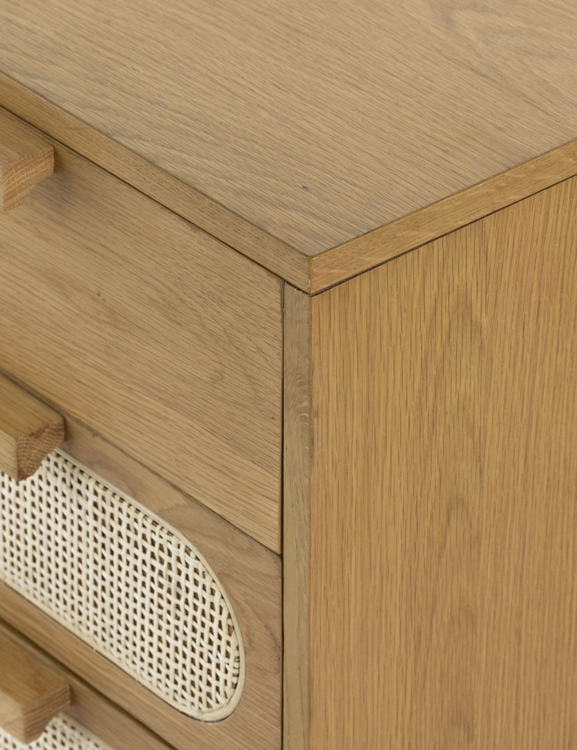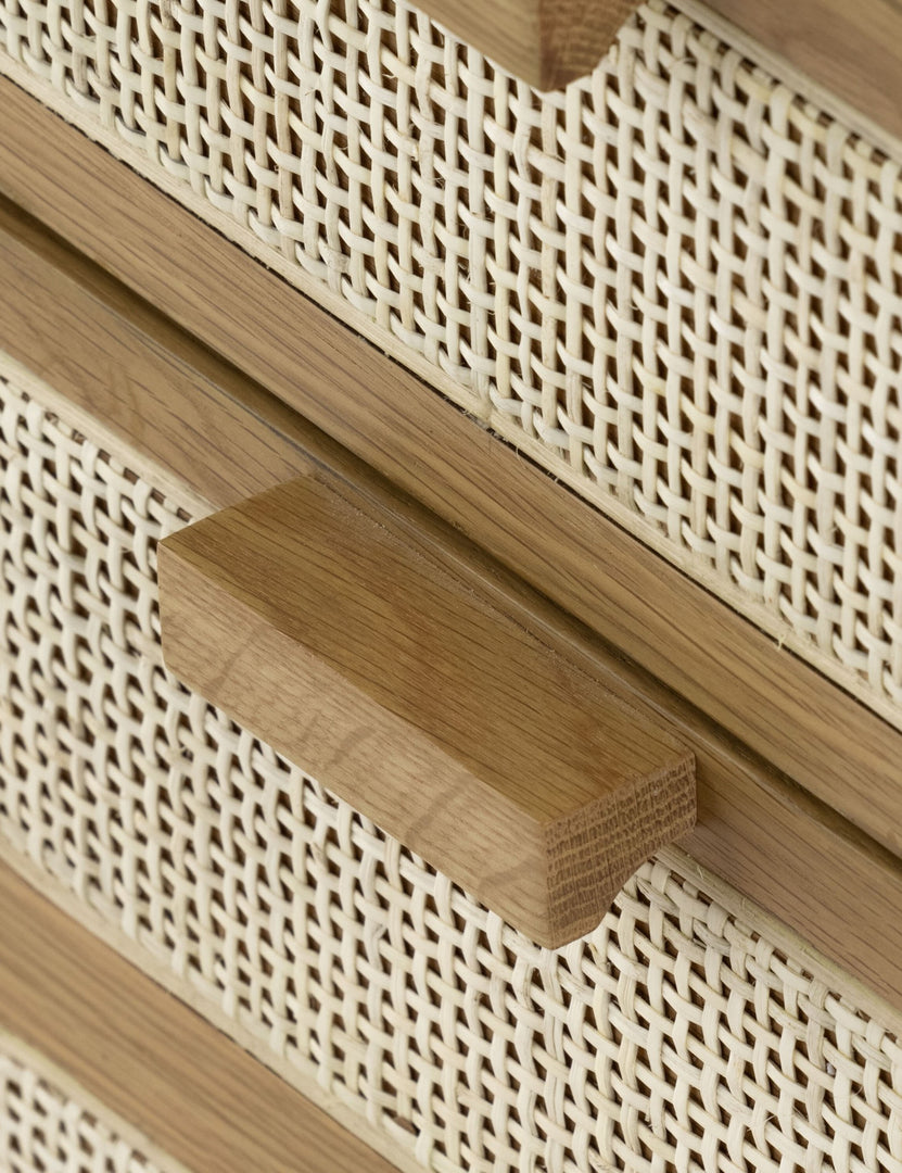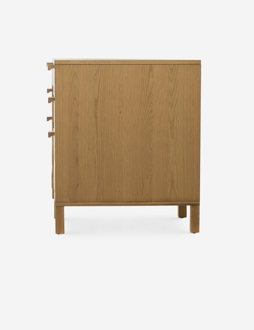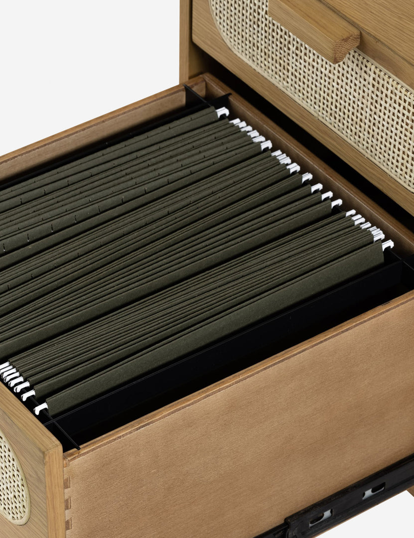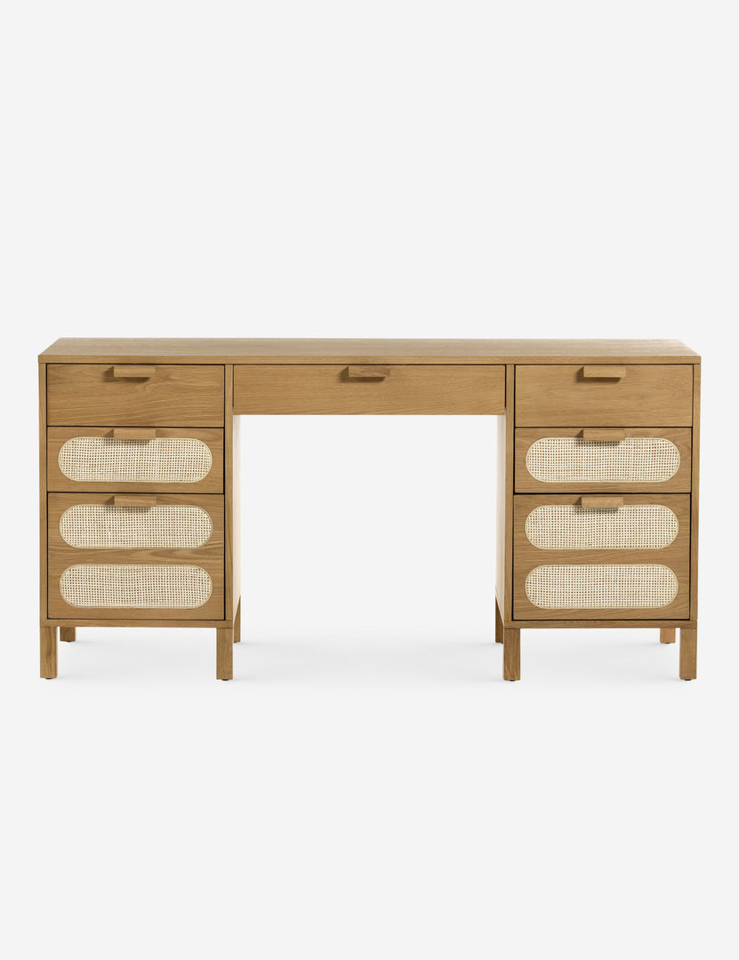 Honey-finished oak and oval-shaped cane paneling inspire transitional appeal in the Verna Executive Desk. With seven drawers—including two for file storage—plus rear cutouts for cord management, this light wood desk is set for effortless warmth in your home office.