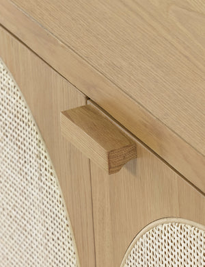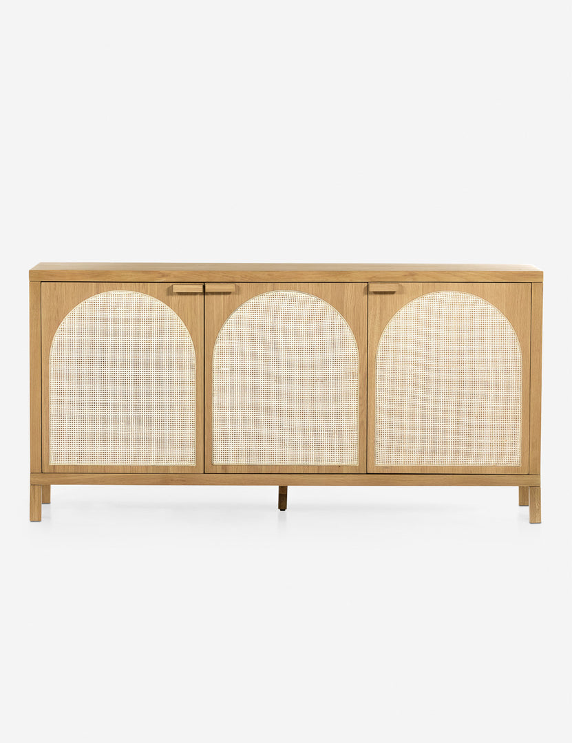 Honey-finished oak and arched cane paneling inspire transitional appeal in the Verna Sideboard. With spacious shelving and rear cutouts for cord management, this versatile piece can add effortless warmth to your look, whether styled as a media console or sideboard buffet.