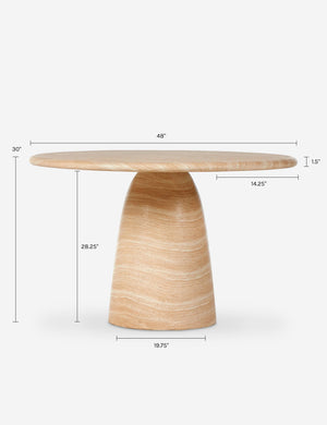 Concrete is transformed in this sculptural dining table. A round slab sits atop a domed pedestal, finished to reflect the mineral textures and tones of travertine. This table is the perfect centerpiece for a refined yet grounded dining space.