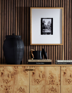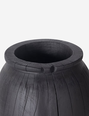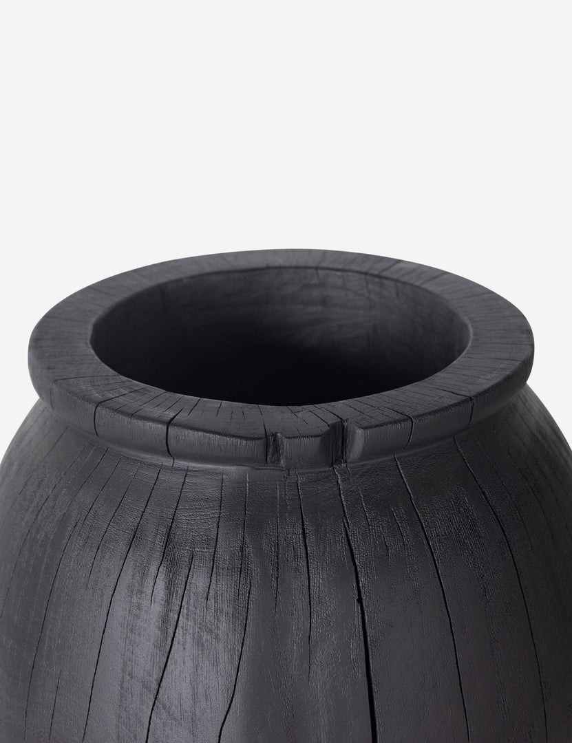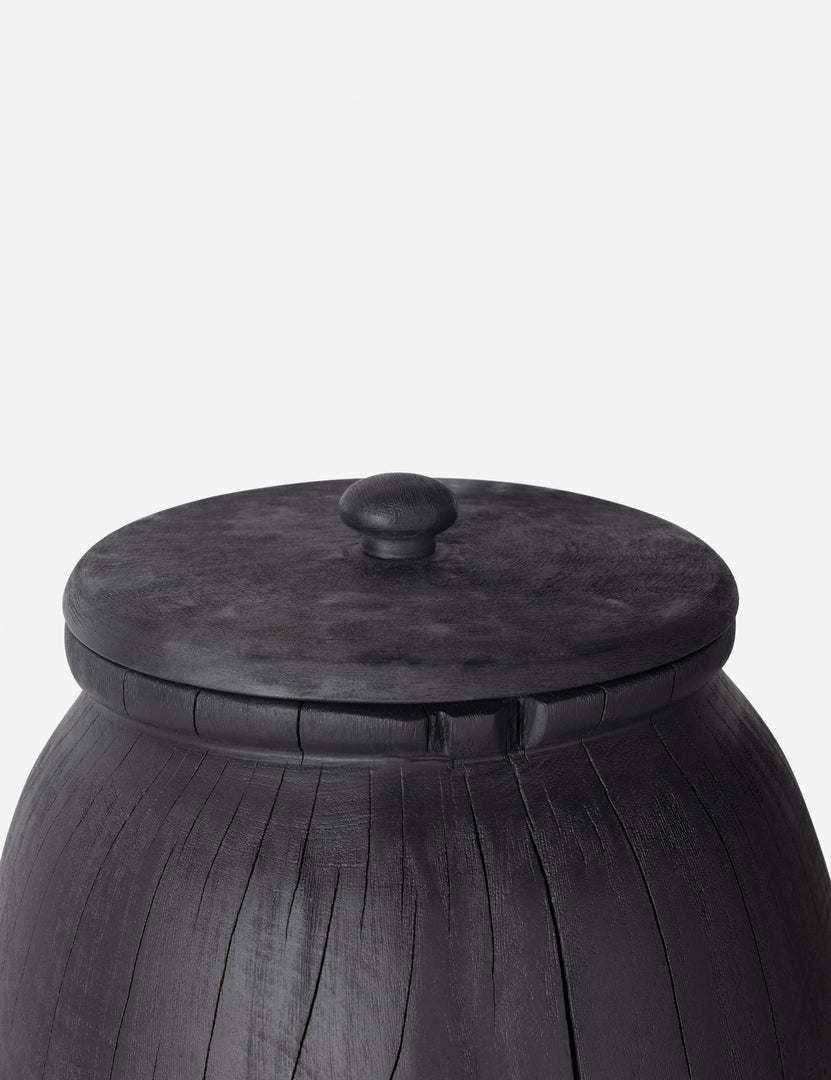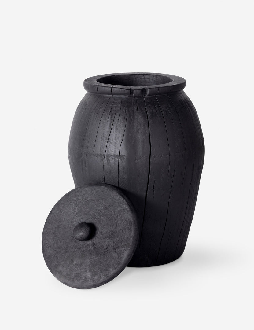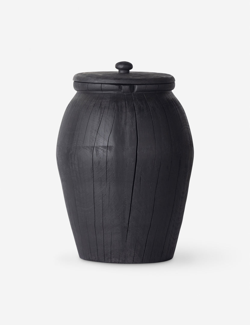 Weda offers a classic urn-style silhouette rooted in organic warmth. The decorative vessel and lid are made from reclaimed wood, showing a natural grain character through the carbon black finish. We love this piece for bringing visual weight and rustic texture to any surface.