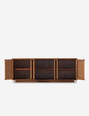 Bring texture tableside with the Wenzel sideboard. Its woven doors set the tone for warmth and sophistication, perfectly complemented by the natural grain and rich finish of the mahogany. Three sets of doors with brass pulls open to spacious storage for table linens, dishes, and more.