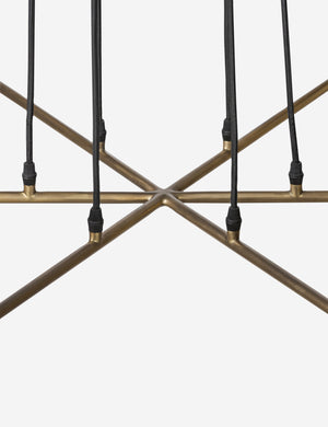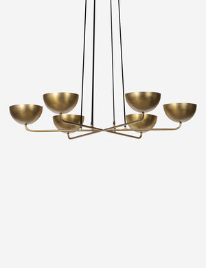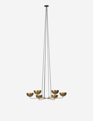 The Winfield chandelier features six burnished brass bowls perched atop a minimalist frame suspended from adjustable black fabric cords. The nested bulbs cast a warm, diffused glow, setting the tone for an elevated dining room or gathering space. Style this piece for a striking yet balanced statement with a generous pour of ceiling light overhead.