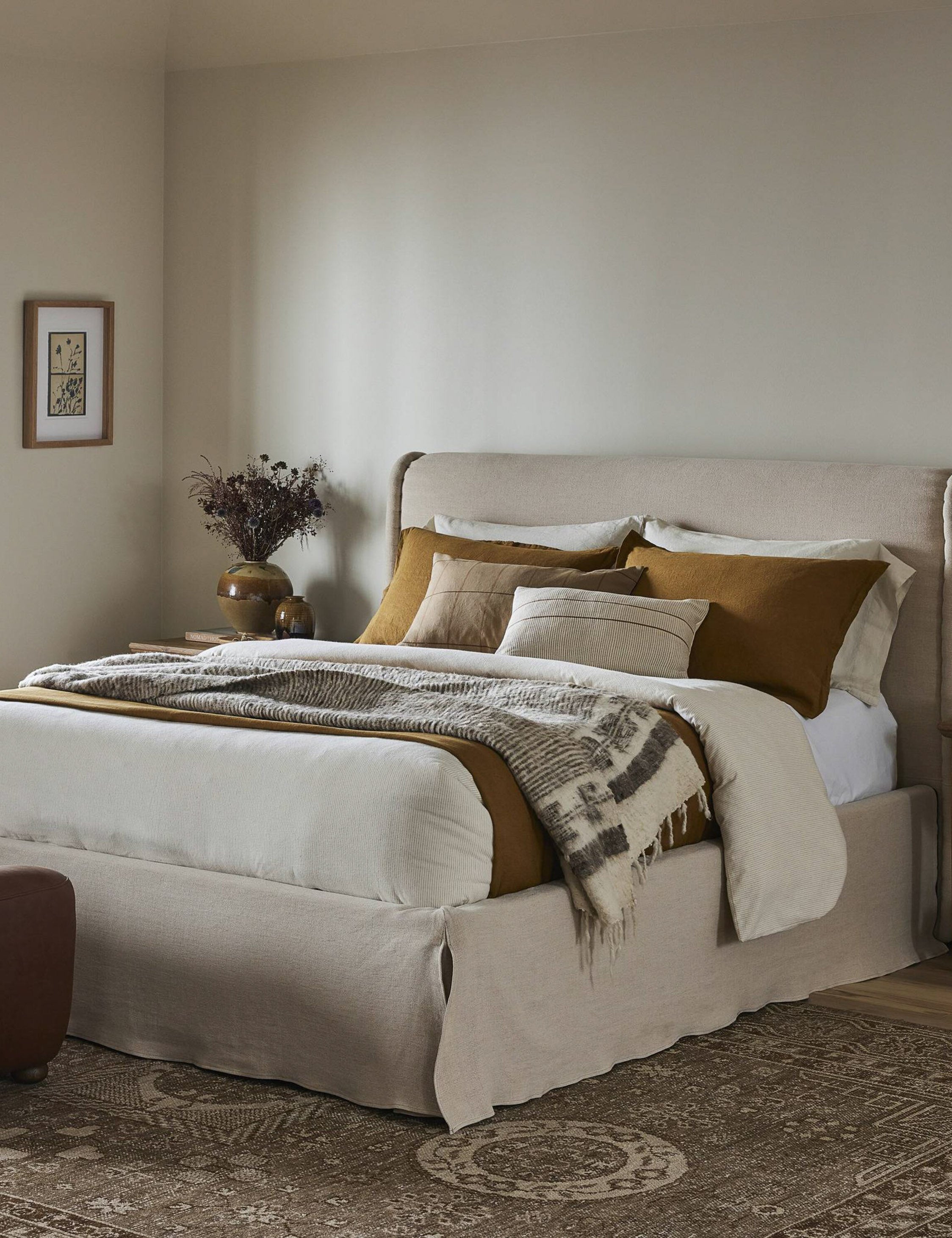 Four Hands brings their exceptional craftsmanship to a timeless collection rooted in Amber Lewis' perennial California style. Soft linen is delicately draped and kick pleated to create a tailored skirt for this modern bed. Its thick, padded headboard features an oversized welt edge that creates a touch of texture and definition for a bed frame that's built to impress in a refined primary suite.
