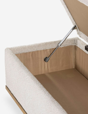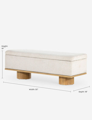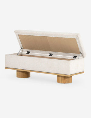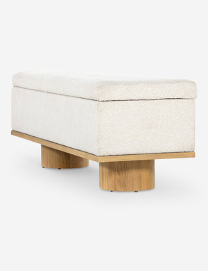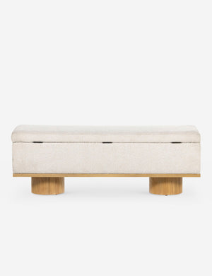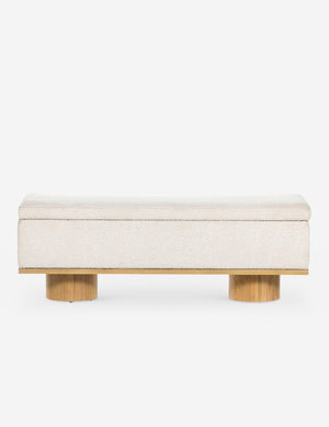 Soft style meets functional appeal in this chic bench with storage. Two oak, column-style legs add a touch of sophistication while the performance upholstered trunk offers storage, seating, and a spare surface for your entryway, bedroom, or a small-space lounge.