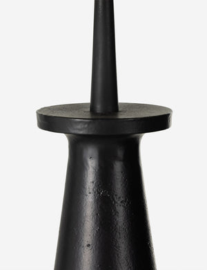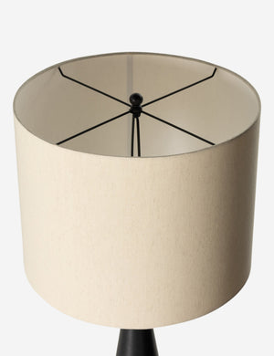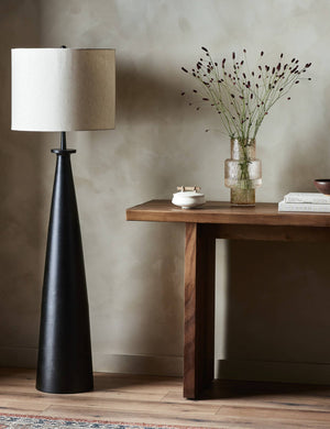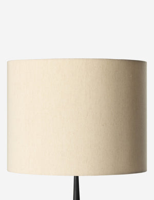 Sleek lines and a textural black aluminum base create an industrial statement piece in the Zakai floor lamp. The off-white drum shade casts a beautifully diffused light to soften and complement this modern lamp design.